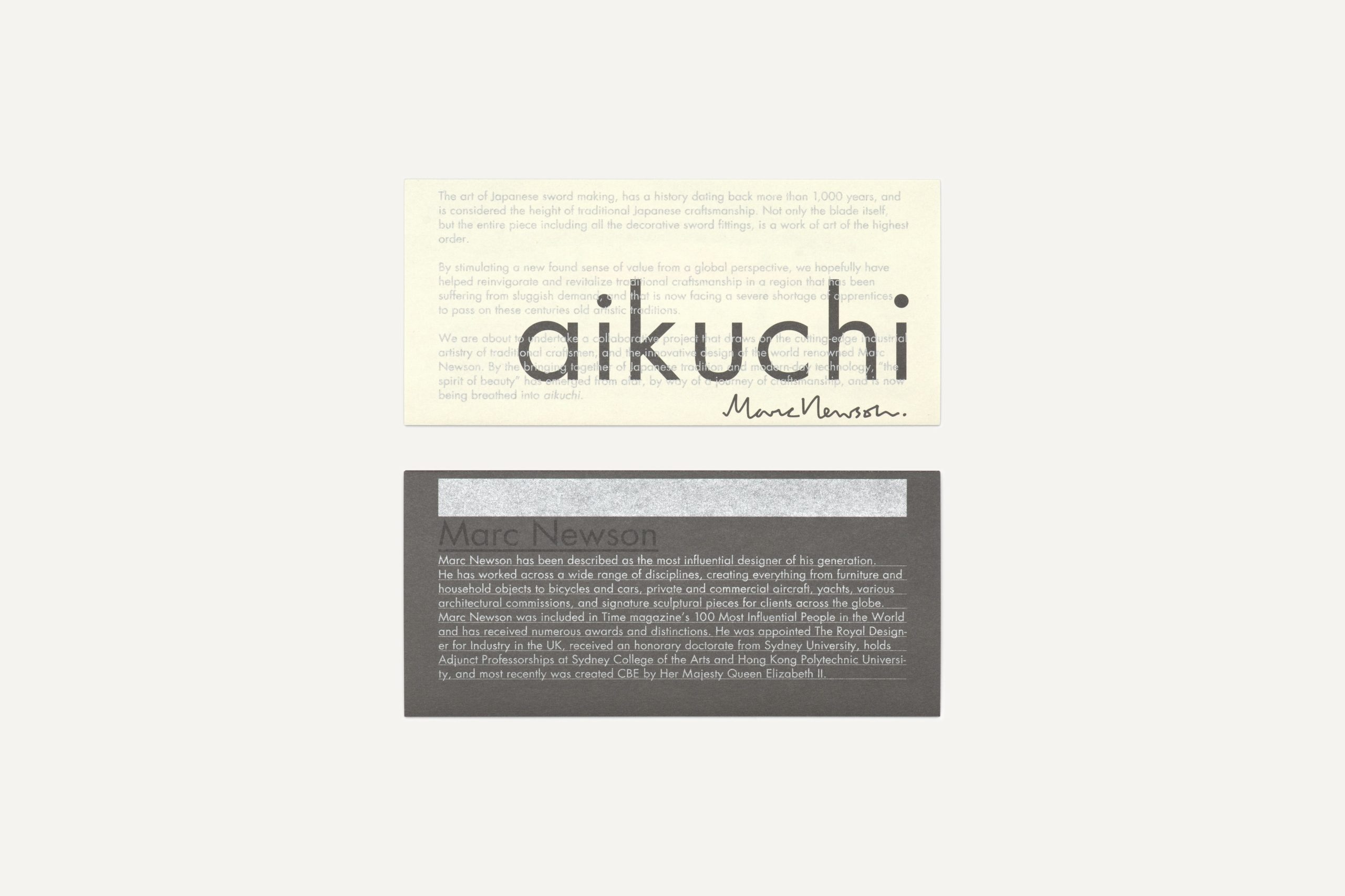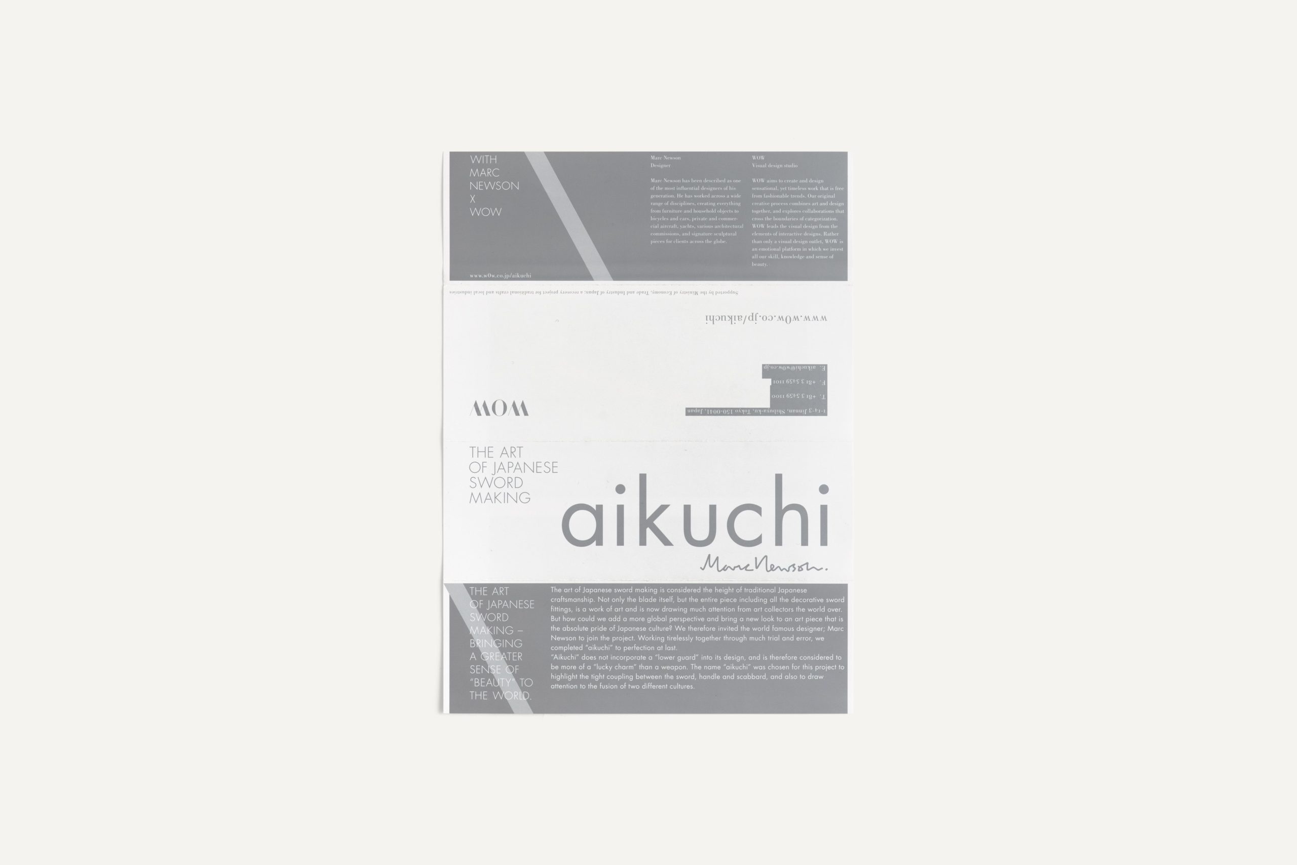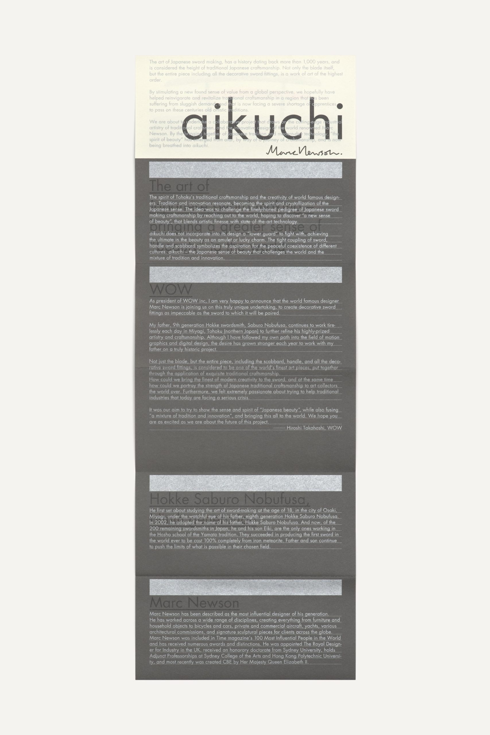 In March 2014, world-renowned product designer Marc Newson unveiled his limited edition “aikuchi” katana sword and special packaging. &Form was hired to create the logo and leaflet for the product, as well as invitation cards for the launch events at Tokyo Art Club and Aman Tokyo, and the exhibition graphics for the Tokyo Art Club. Different gray tones, silver color and a special printing technique were employed to convey the reflective, multi-faceted nature of the katana blade.