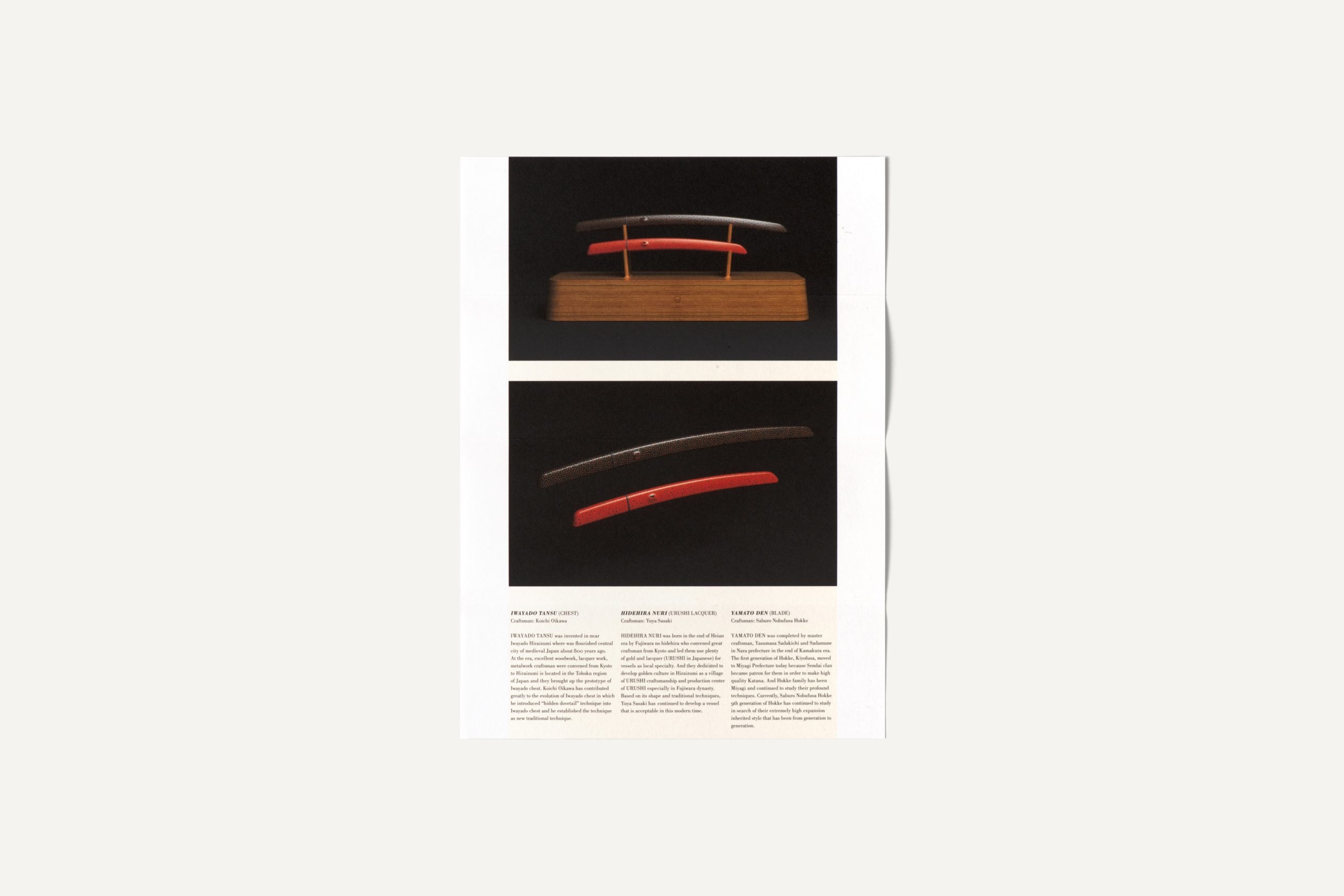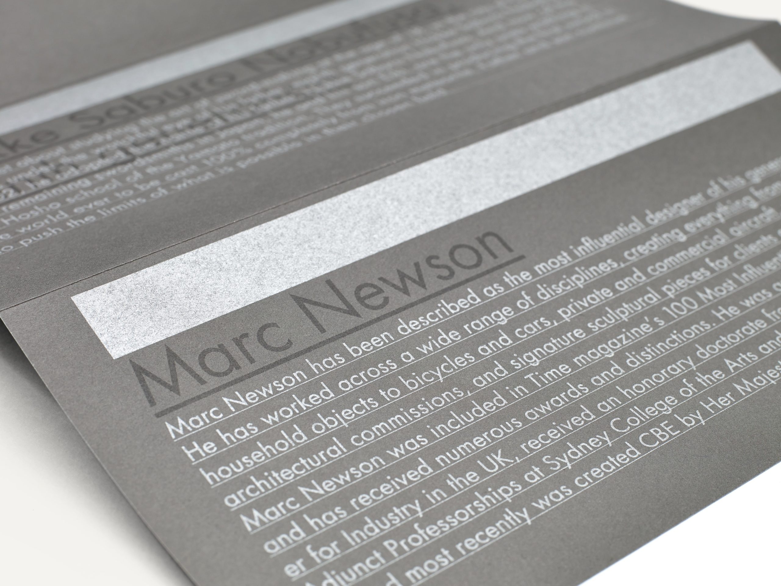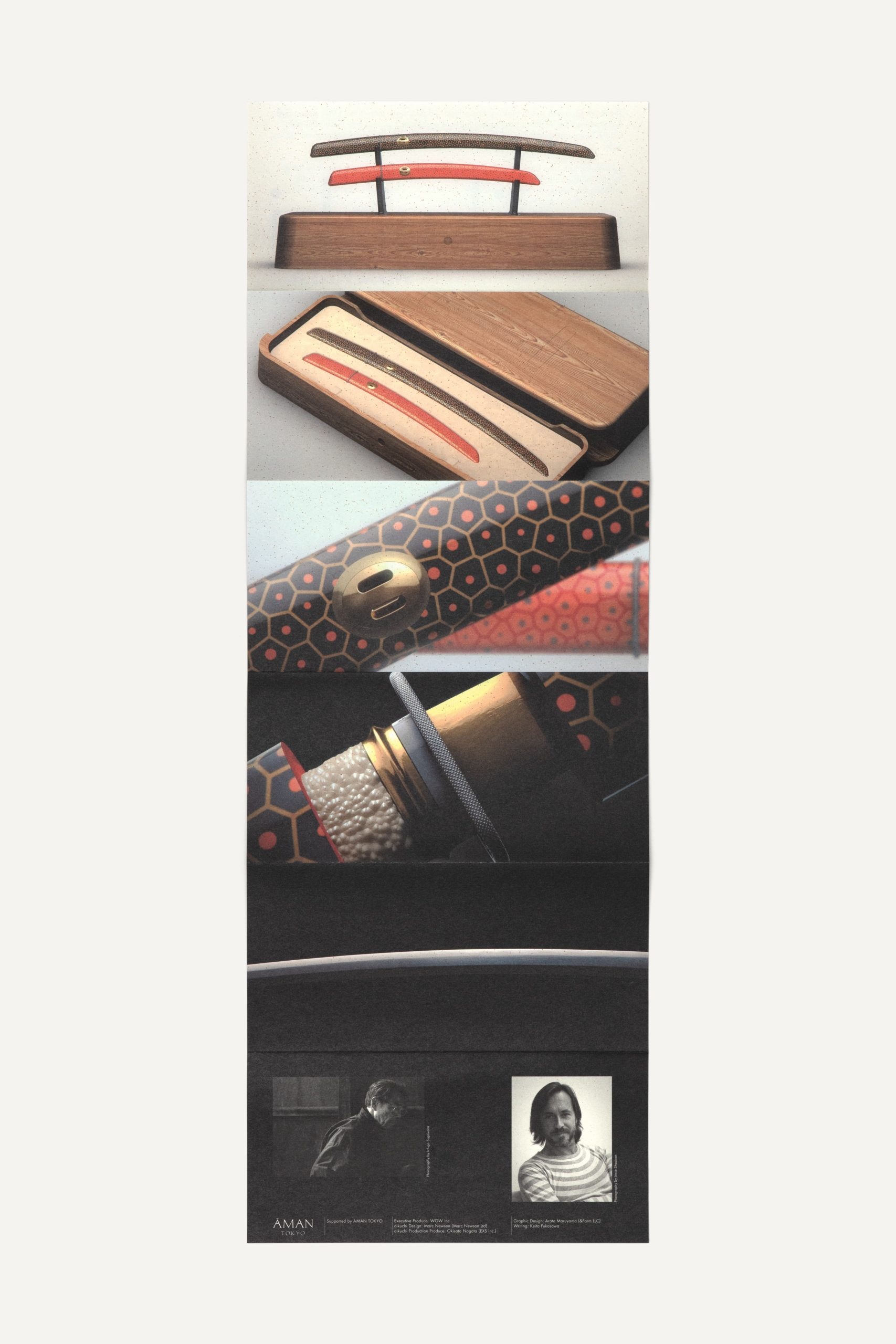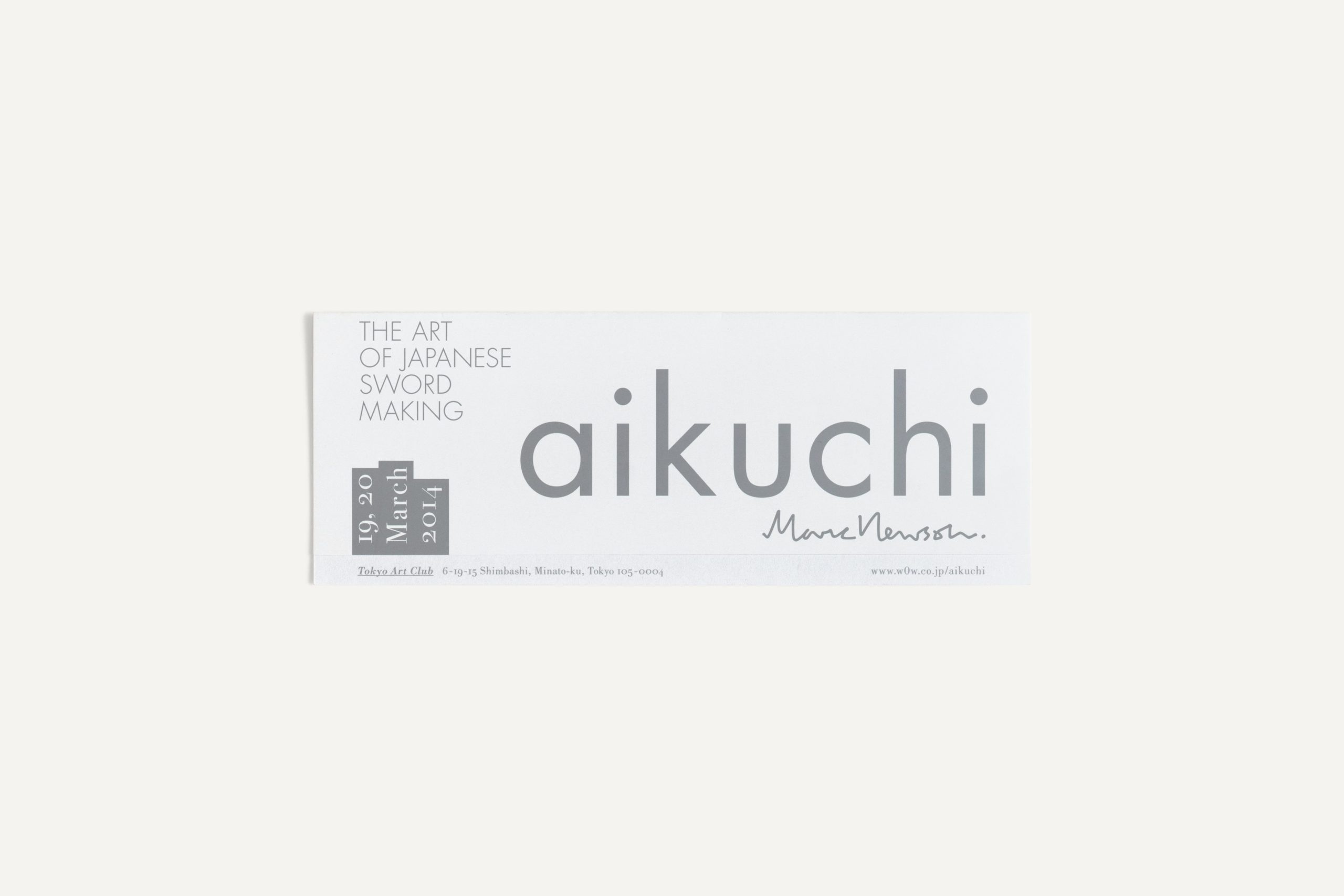 In March 2014, world-renowned product designer Marc Newson unveiled his limited edition “aikuchi” katana sword and special packaging. &Form was hired to create the logo and leaflet for the product, as well as invitation cards for the launch events at Tokyo Art Club and Aman Tokyo, and the exhibition graphics for the Tokyo Art Club. Different gray tones, silver color and a special printing technique were employed to convey the reflective, multi-faceted nature of the katana blade.