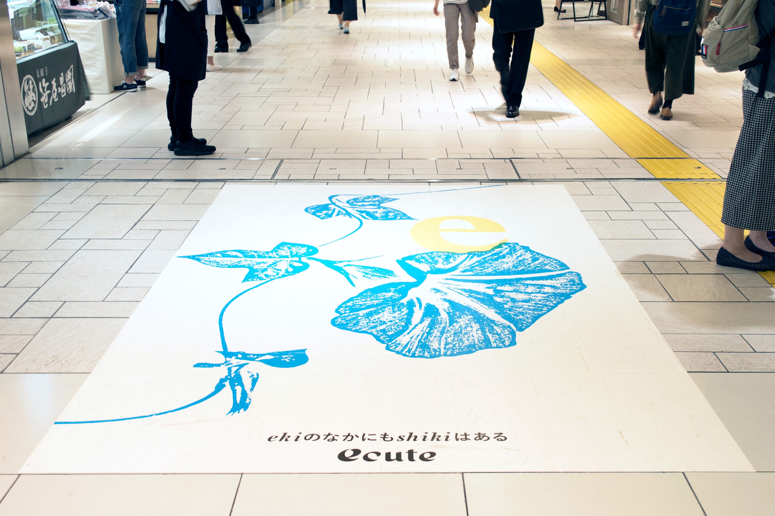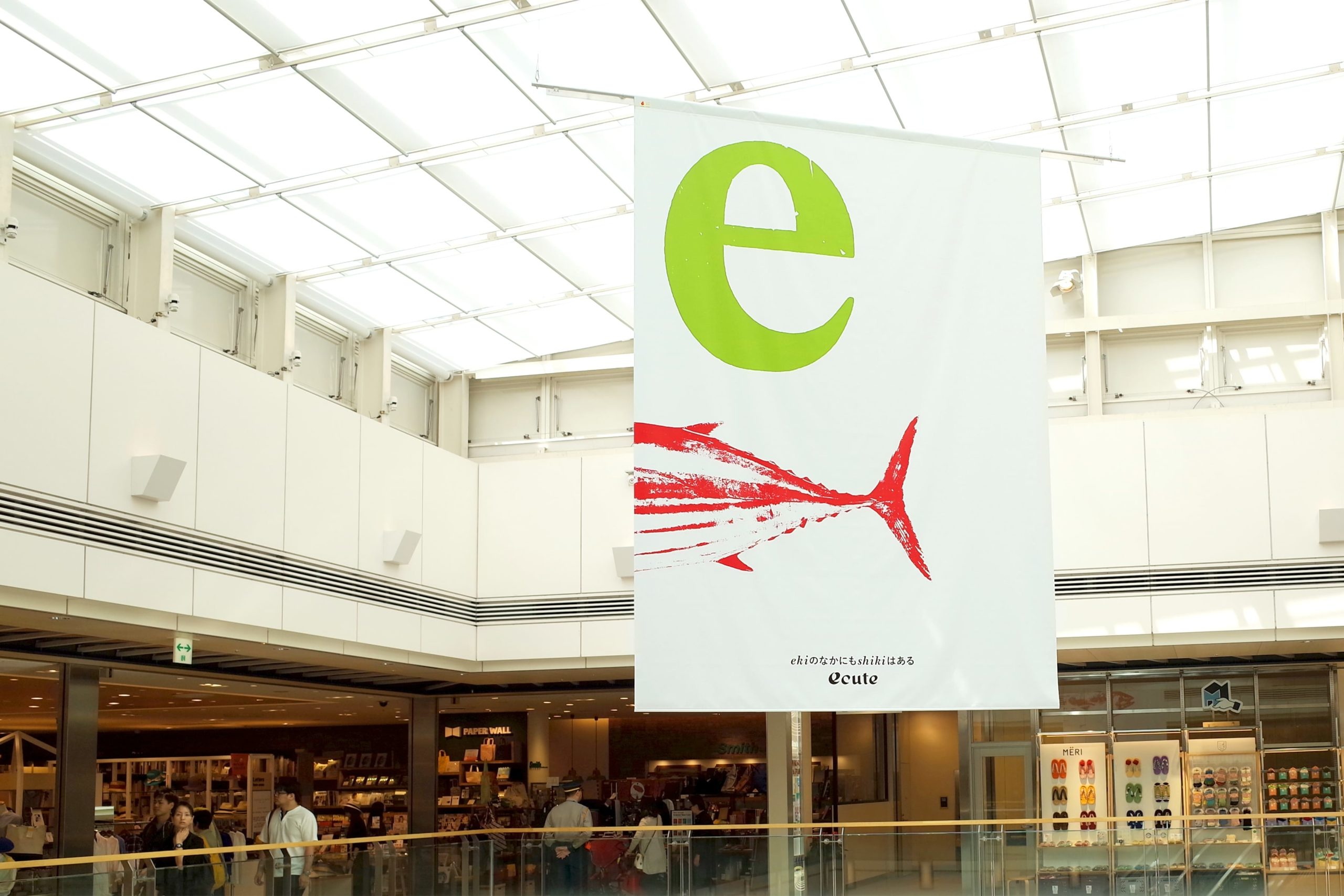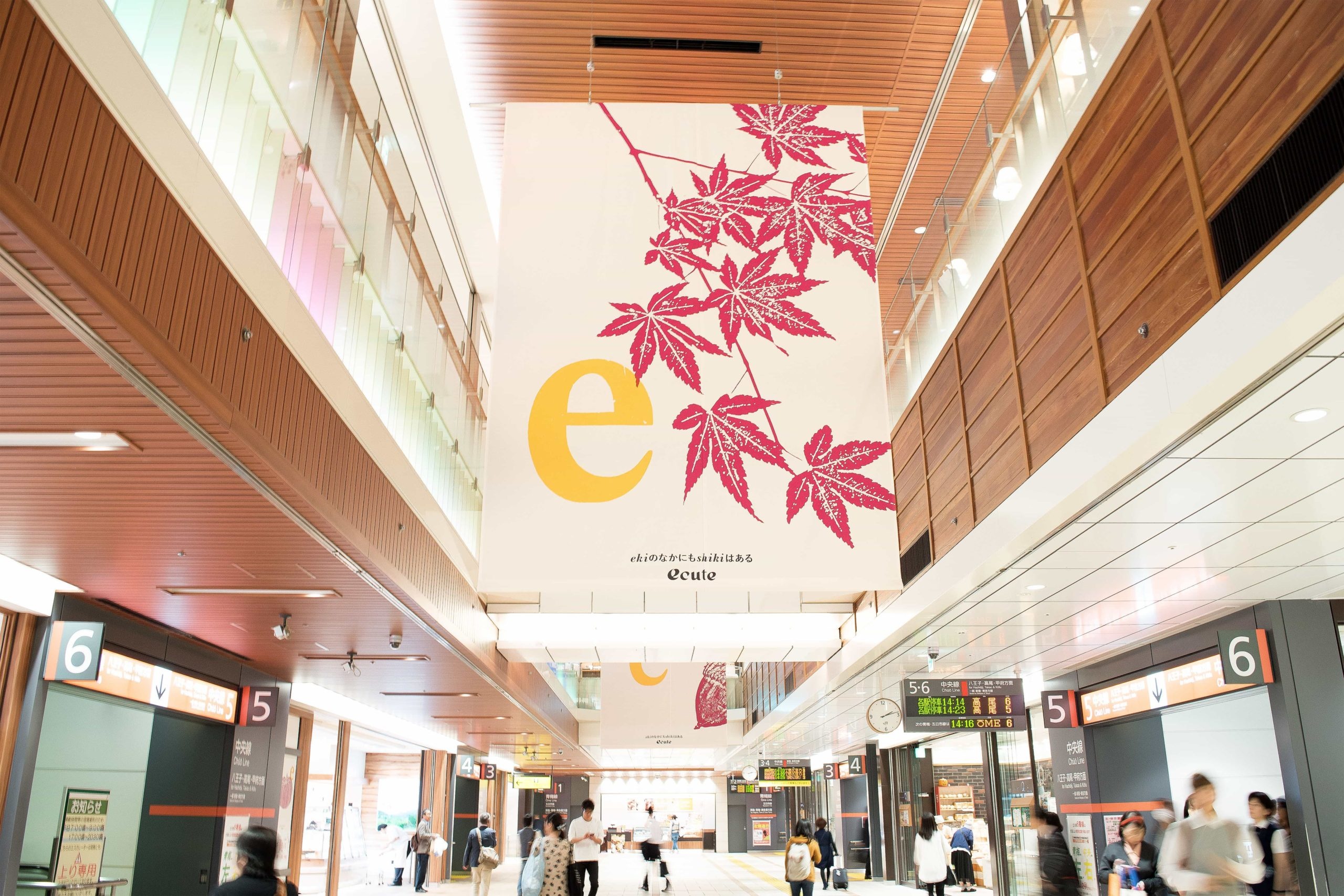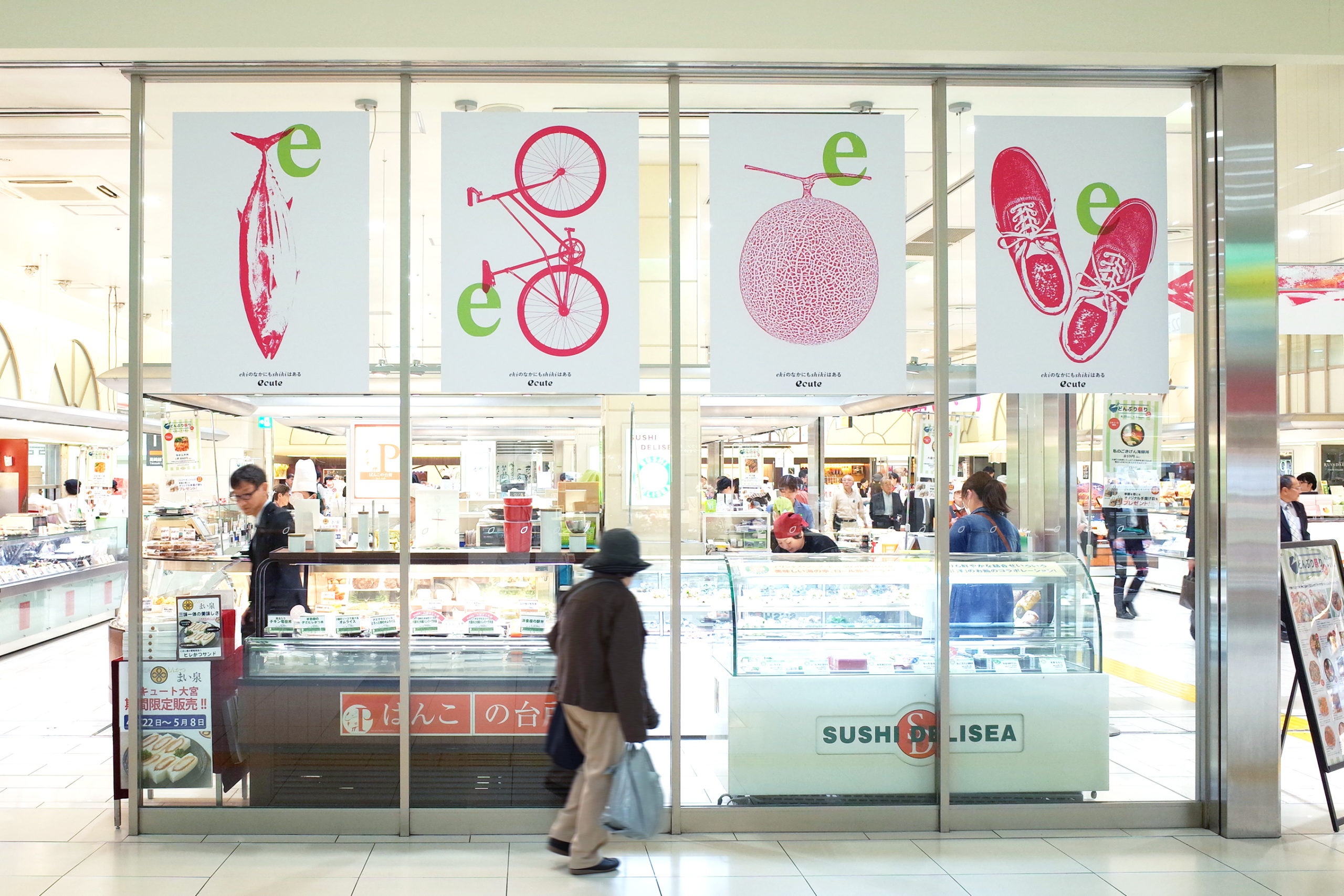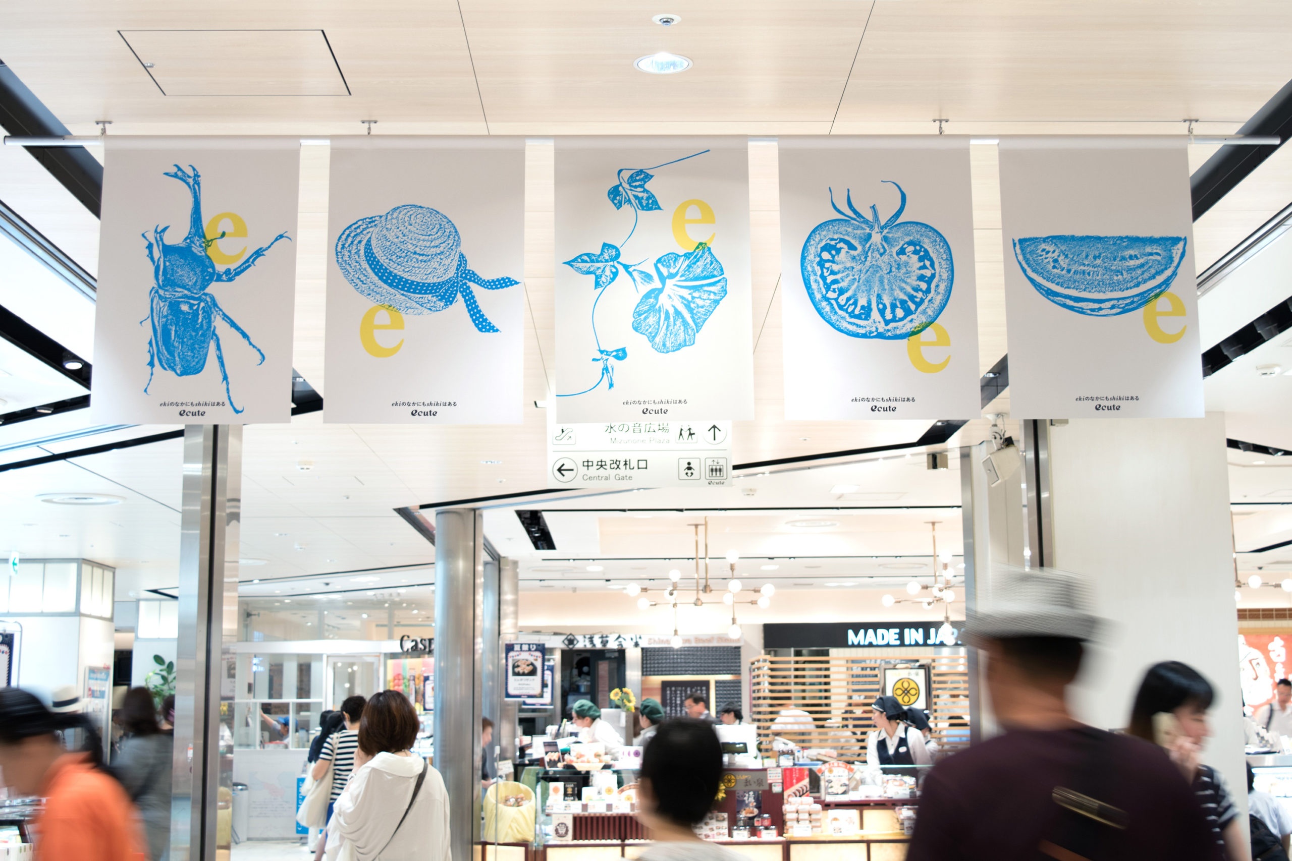 Seasonal branding for a commercial facility called ecute located in selected JR train stations was carried out focusing on designs that are simple but give a striking impression for venues with an information-rich nature. Centering the metal type ‘e’ as a symbol, and using the motifs of the four seasons designed in the form of fish-prints to create a seasonal ambience for busy commuters, a naïve picture letter-like communication was pursued.