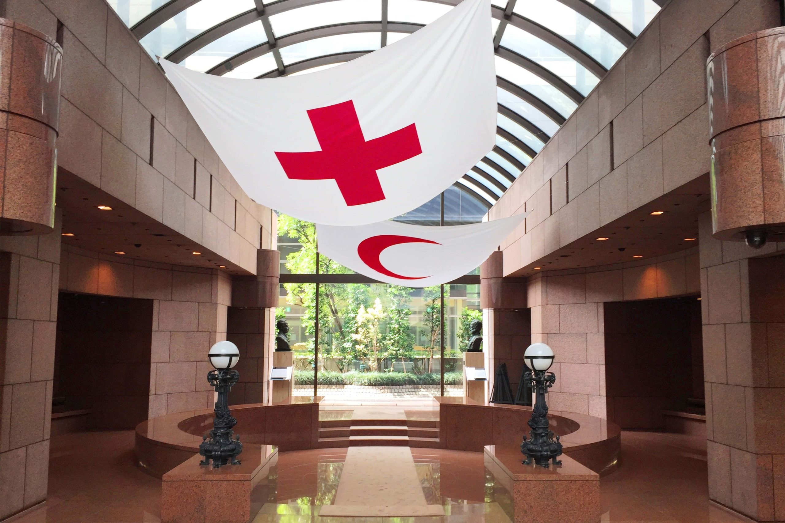 In all aspects, We took into consideration the Japanese Red Cross Society’s principles of “humanity, impartiality, neutrality, independence, voluntary service, unity, and universality,” and sought to use preexisting material. For the entrance redesign, We removed various advertisement posters and panels to make way for visually powerful banners featuring the iconic red cross and red crescent that were hung from the ceiling. The original busts of the two founders H Dunant and T Sano were positioned to flank the entrance door.