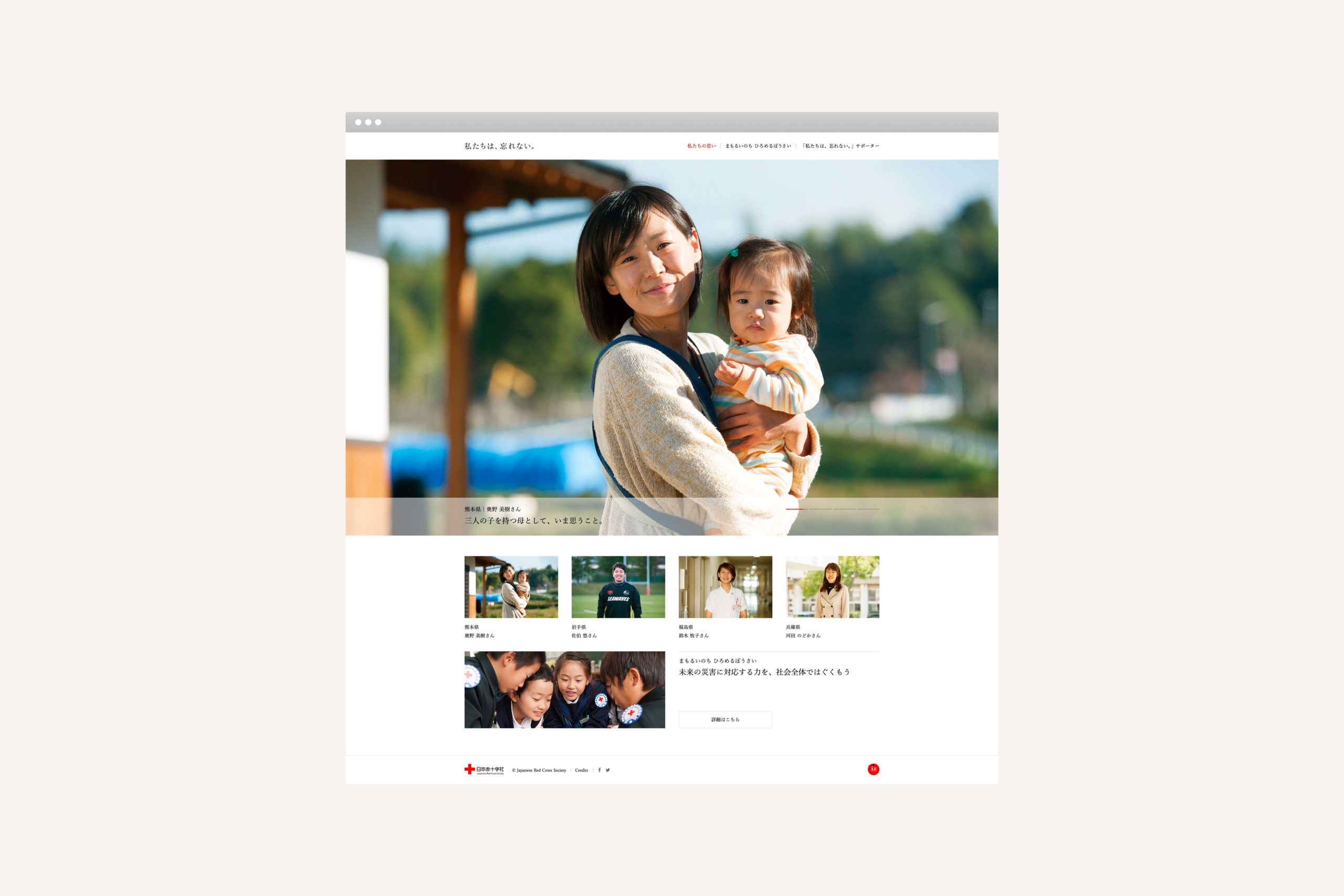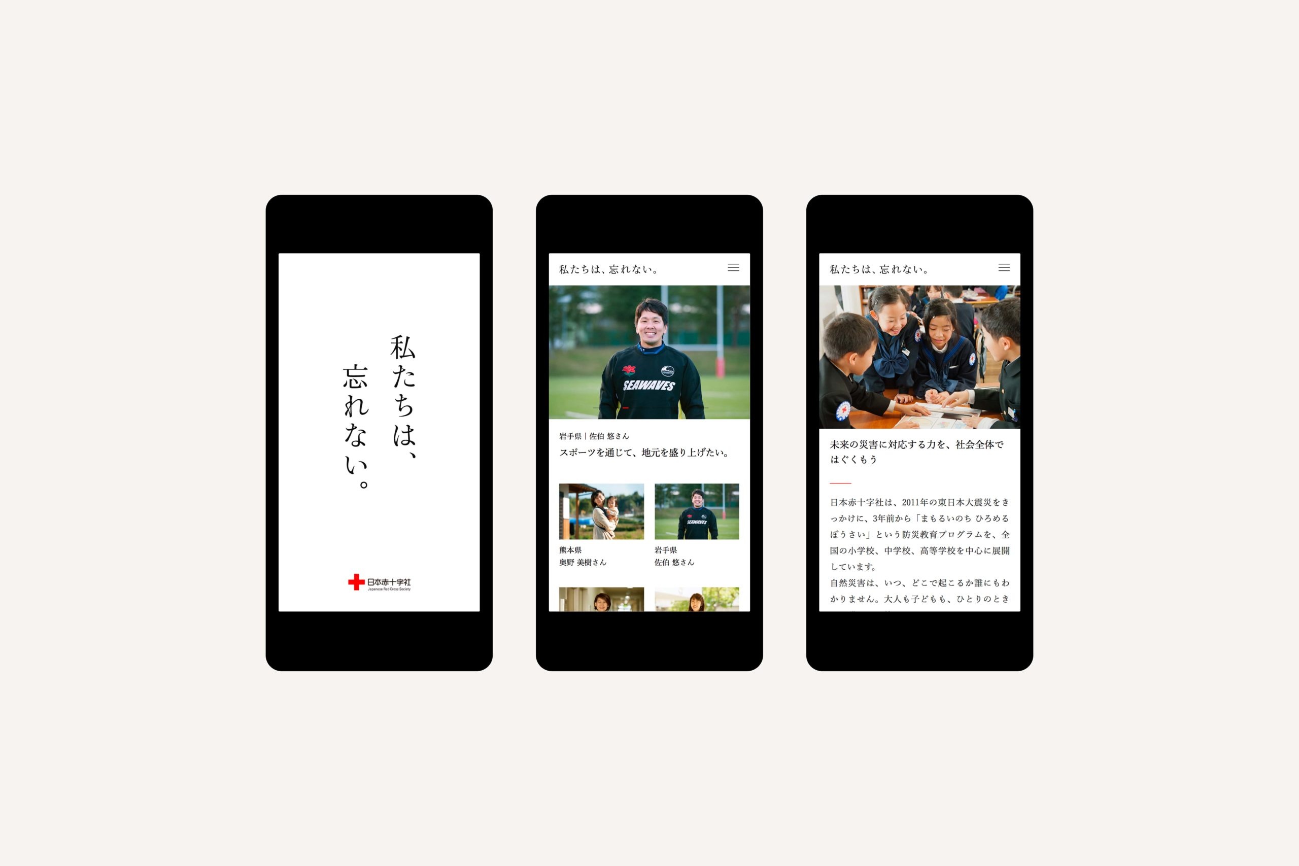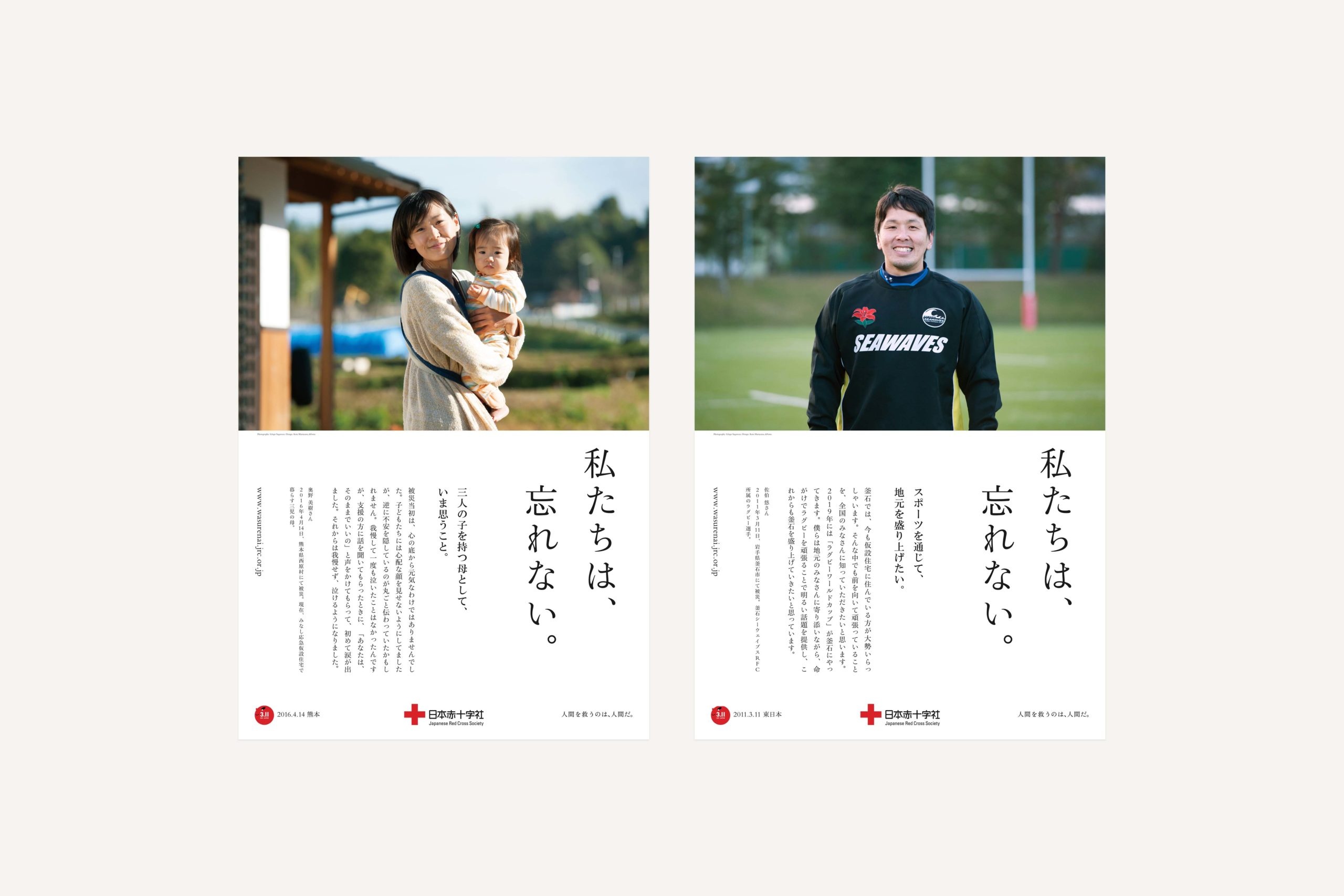 We were involved in the art direction and design of the “Forever Remembered” campaign, which sought to bring attention once again to past natural disasters in Japan such as the 1995 Hanshin earthquake and 2011 Tohoku earthquake and tsunami. Executed in print and digitally, emphasis was placed on the use of text to convey the voices of people of various walks of life - a mother, an athlete, a nurse, a teacher, and students.